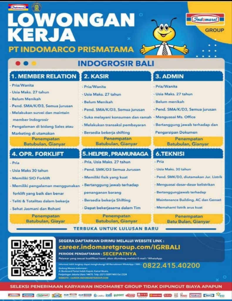Indomaret Group tepatnya Indogrosir Bali sedang mencari kamu nich untuk bergabung menjadi staf karyawan. Ada banyak Posisi yang dibuka lowongan pekerjaannya, ayo ambil kesempatan besar ini. Ikut rekrutmen Indogrosir Bali dilaksanakan pada :